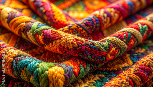 Vibrant Textile: A close-up of a textile showcasing a mesmerizing array of colorful embroidered threads, a testament to artisanal craftsmanship, with rich textures and hues that invite the eye.