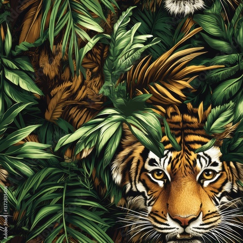 tiger, tropical rainforest, foliage, wildlife, illustration, nature, lush, green, animal, dense forest, wildcat, intricate, portrait, majestic, flora, fauna, ecosystem, predator, detailed, conservation, biodiversity, jungle, adventure, exploration, untamed, high-coloured, wilderness, aesthetic, artistry, fierce, natural beauty, endangered species, animal kingdom, generative, ai