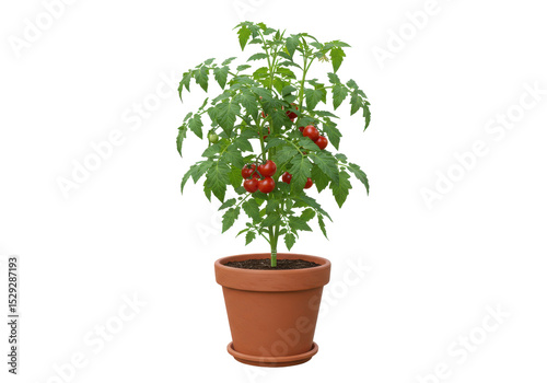 Vibrant tomato plant in a terracotta pot, showcasing ripe tomatoes against a neutral background