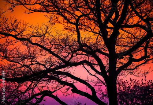 vibrant tree silhouette showcasing intricate details colorful background, art, artwork, display, exhibit, showcase, scene, scenery, nature, branch, leaves