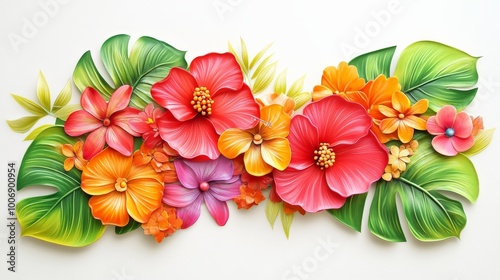 tropical, floral, hibiscus, flower, bouquet, nature, botanical, vibrant, colourful, exotic, leaf, foliage, palm, plant, bloom, blossom, bright, high-coloured, garden, flora, arrangement, decoration, design, background, summer, tropics, paradise, beauty, freshness, greenery
