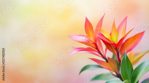 Vibrant tropical plant with colorful petals against a soft, dreamy background.