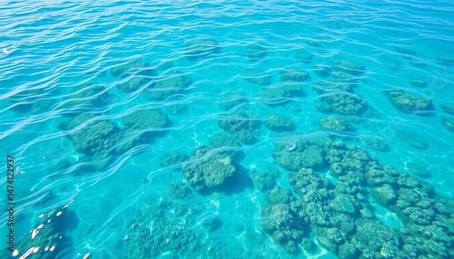 Vibrant turquoise ocean water, crystal clear, shallow reef visible, ocean view, calm