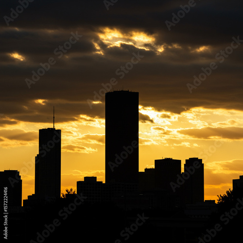 Vibrant urban sunset silhouettes the city skyline and majestic downtown buildings