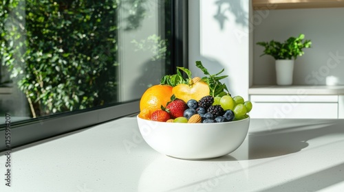 Vibrant vegan fruit bowl with colorful fruits and nuts minimalist kitchen setting bright daylight straight-on shot realistic presentation