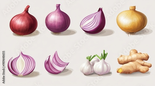 vegetable, onion, ginger, garlic, shallot, flavouring, ingredient, red, onion, purple, yellow, minimal, vector, design, clean, shape, soft, pastel, colours, isolated, transparent, background, culinary, illustration, cooking, aromatic, vegetable, food, kitchen, artwork, receipe, styling, clip art, collection, template, spice, white, healthy, fresh, organic, bulb, ingredient, raw, vegetarian, pepper, ripe, closeup