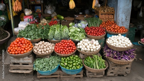 vegetable, market, produce, stall, fresh, tomatoes, green, red, basket, organic, farm, food, local, shop, street, seller, farmer, seller, display, racked, colourful, variety, selection, healthy, diet, grocery, shopping, asian, south, east, asia, rural, urban, daytime, sunlit, natural, wooden