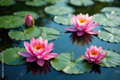 Vibrant water lilies create a floral pattern across the lake's surface, colorful, botanical