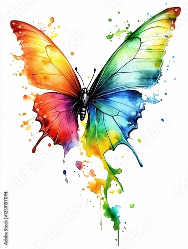 Vibrant watercolor butterfly with rainbow wings and paint splatters on a white background