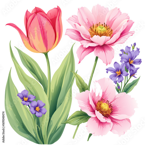 floral, flower, tulip, poppy, pink, purple, orange, green, watercolor, illustration, botanical, nature, bloom, stem, leaf, garden, bouquet, art, design, decorative, vibrant, fresh, delicate, elegant, spring, summer, beauty, natural, organic, artistic, painted, drawing, graphic, element, detail, arrangement, collection, set, flocked, composition, flora, blossom, growth, life, colourful, bright, soft, gentle