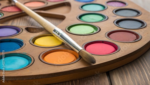 Vibrant Watercolor Paint Set on Wooden Palette with Brush – Artistic Painting Tools for Creatives