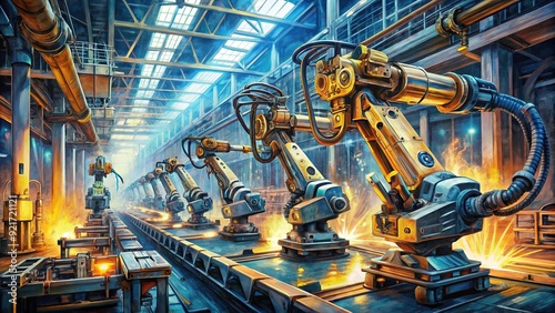Vibrant watercolor painting depicts a futuristic robotic assembly line, with metallic parts and wires coming together to form a powerful, glowing, industrial fighting machine.