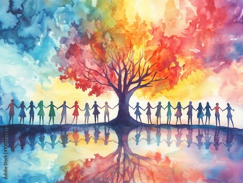 Vibrant watercolor painting of people holding hands colorful tree