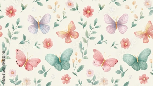 Vibrant Watercolor Seamless Pattern Featuring Butterflies and Flowers on a Soft Background