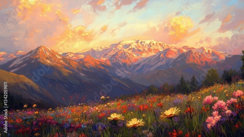 Vibrant Wildflower Meadow and Majestic Mountain Sunset