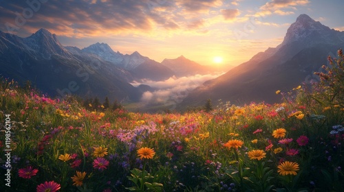 Vibrant Wildflower Meadow at Sunrise in the Mountains
