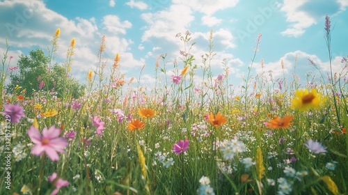 wildflower, meadow, summer, blooming, nature, scene, colourful, bright, vibrant, field, plant, flora, landscape, spring, beauty, garden, background, texture, image, photo, picture, design, artistic, pretty, aesthetic, happy, joyful, serene, peaceful, sun, sky, cloud, green, pink, orange, yellow, purple, white, red, cosmos, daisy