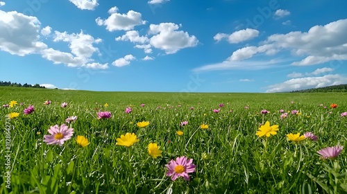 wildflower, meadow, nature, greengrass, blue skies, cloud, vibrant, flower, field, serene, tranquil, outdoors, landscape, scenic, springtime, natural beauty, peaceful, idylli, rural, greenery, bright, puffy clouds, fresh air, open space, countryside, colorful flowers, scenic beauty, lush, horizon, floral, blooming, sunshine, panoramic, scenic view, picturesque, wilderness, untouched, simplicity