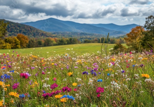 Vibrant Wildflower Meadow with Mountains Under Dramatic Sky in Autumn Season, Nature Landscape Capturing Flora and Scenic Beauty