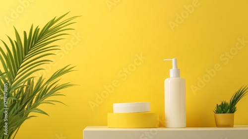 Vibrant Yellow Aesthetic Display with Beauty Products and Plants