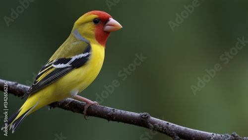 bird, yellow, red, colourful, small, finch, perched, nature, wildlife, songbird, tropical, avian, cute, feathered, animal, beauty, fauna, exotic, bright, high-coloured, closeup, photo, tree branch, forest, garden, meadow, song, wild, conservation, endangered, zoology, ornithology, pretty, beautiful, spring, summer, birding, pet, rare