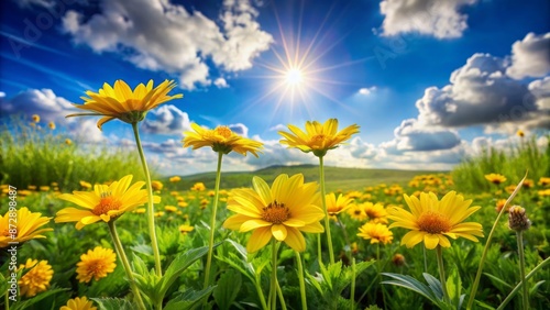vibrant, yellow, flower, blooming, lush, green, meadow, natural, leaf, border, blue, cloudy, sky, background, soft, blurred, cloud, sunny, bright, warm, fresh, grass, isolated, landscape, scene, summer, rustic, nature, scenery, peaceful, serene, calm, still, photo, isolation, pure, unaffected, idylli, tranquil, attractive, beautiful, lovely