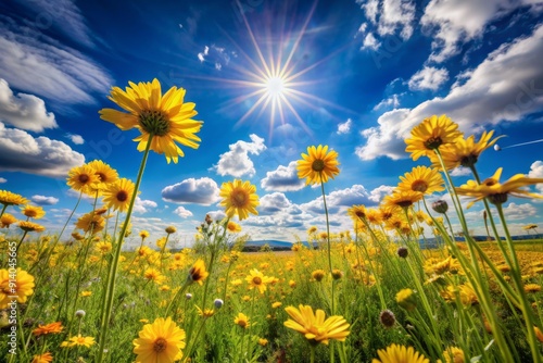 Vibrant yellow flowers sway gently in the breeze, blanketing a serene landscape with bright sunshine and a few puffy white clouds in the blue sky.