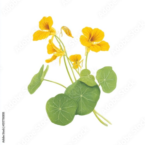 nasturtium, flower, yellow flower, green leaf, plant, botanical, floral, nature, spring, summer, blossom, bloom, closeup, isolated, white background, illustration, painting, drawing, art, herb, garden, bright, vibrant, fresh, detailed, realistic, macro, leaf, stem, bud