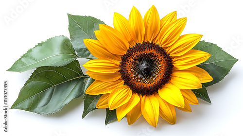 Vibrant yellow sunflower with green leaves isolated on white background.