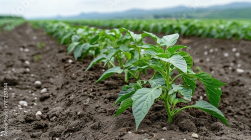 Vibrant young green pepper plants in rich brown soil, expansive agricultural landscape under cloudy sky, symbolizing growth and sustainability.