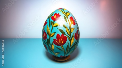 Vibrantly painted Easter egg with colorful floral designs on a turquoise background, perfect for spring celebrations and holiday decor