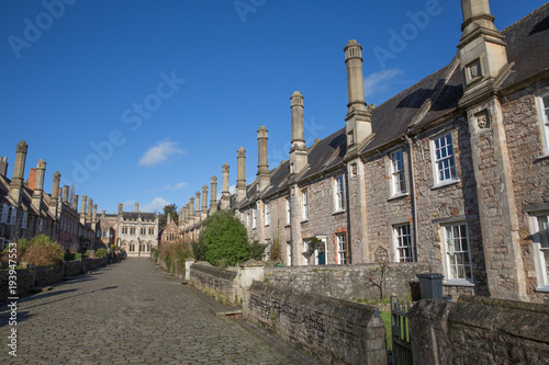 Vicars Close next to Wells Cathedral Somerset England uk historic row of cottages, houses and chimneys