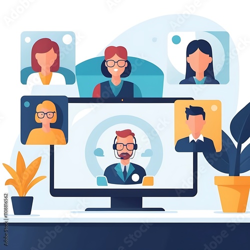 Video conference concept in modern flat design for web. Colleagues connecting online via zoom call from laptop program, speaking and discussing work, doing tasks remotely in team. Illustration.