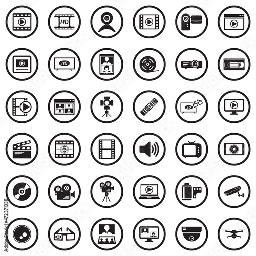 video, icon, black, white, circle, camcorder, camera, cinema, audio, digital, entertainment, film, monitor, motion, motion picture, multimedia, music, online, play, player, projector, reel, remote, screen, set, show, sound, symbol, television, television, vector, three-dimensional, app, buttons, collection, controller, design, frame, illustration, isolated, laptop, media, mobile, object, signs, website, flat, graphic