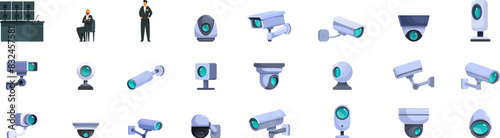 Video surveillance system icons set vector. A collection of various security cameras, including a man in a suit standing in front of a desk