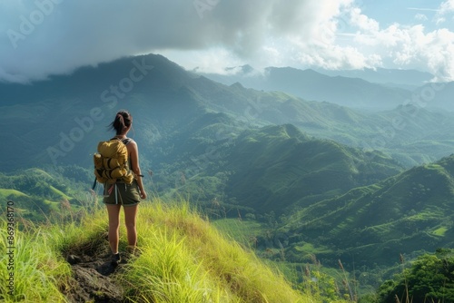 cloud, plant, person, grass, tree, sky, forest, light, clothing, mountain, woman, nature, hiking, landscape, mountain, adventure, people, hiker, backpack, trekking, travel, summer, rock, holiday maker, walking, hike, sport, view, active, peak, alps, backpacker, outdoors