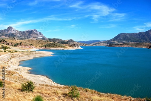 View across the reservoir towards the mountains (Embalse de Zahara), Zahara de la Sierra, Spain.