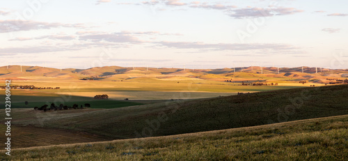 view, vale, wind, farm, farming, sunset, green, electricity, golden light, energy, cloudy, panorama, farmland, crop, cropping, generation, panoramic, wind farm