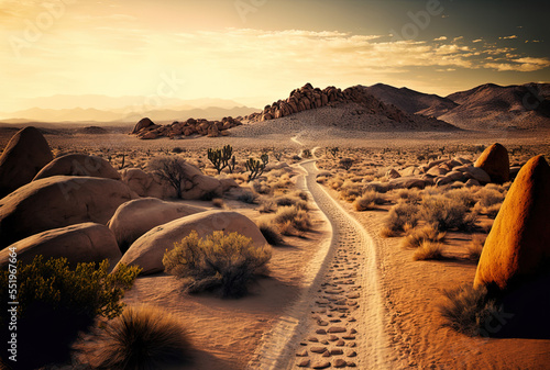 view from a long distance showing a stone pathway surrounded by the desert. Generative AI