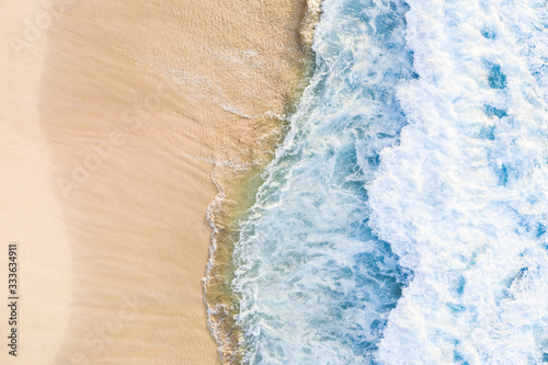 View from above, stunning aerial view of waves crashing onto a beautiful beach during a sunny day. Nyang Nyang Beach (Pantai Nyang Nyang), South Bali, Indonesia...