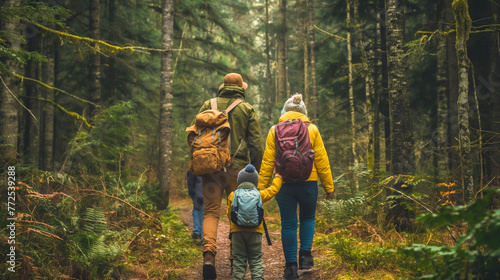 View from behind of a family hiking through a forest clearing, embodying adventure, nature, togetherness, and a shared passion for camping