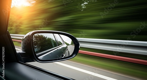 car, driving, road, travel, journey, sunset, sunlight, nature, tree, forest, side, mirror, motion, blur, speed, perspective, outdoors, scenic, landscape, vehicle, transportation, daytime, summer, evening, gold, hours, adventure, freedom, movement