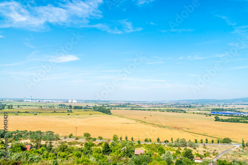 view, vale, green, landscape, top, aerial, grass, nature, travel, house, field, village, summer, sky, countryside, tree, background, agriculture, field, factory, horizon, auto factory, bratislava, slovakia, road, land, building, blue, yellow
