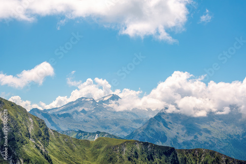 View from Kreuzeck summit (2,204 m) to the Hochalmspitze. It is sometimes called "Tauern Queen" (Tauernkönigin) and at 3,360 m the highest mountain in the Ankogel group. Austrian Alps in summer.