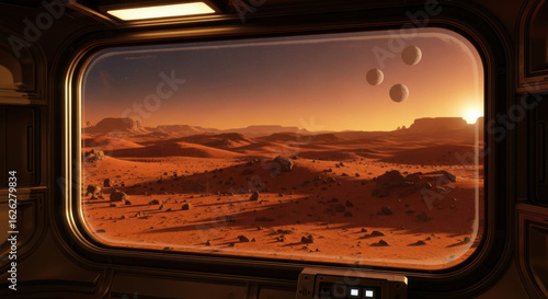 View from spaceship window showing martian landscape with mesas and three moons at sunset on mars