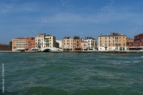 View from the sea at the residential district of waterside with bridge in Venezia, Venice, Italy, Europe