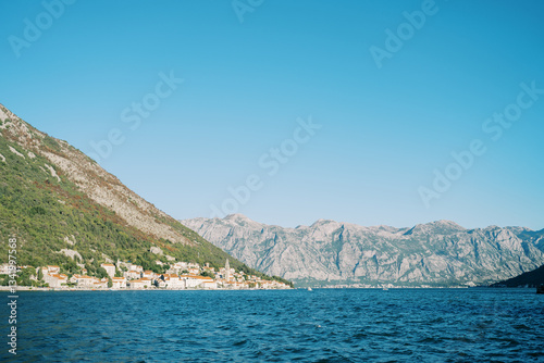 View from the sea of the coast of Perast at the foot of the mountains surrounded by a mountain range. Montenegro