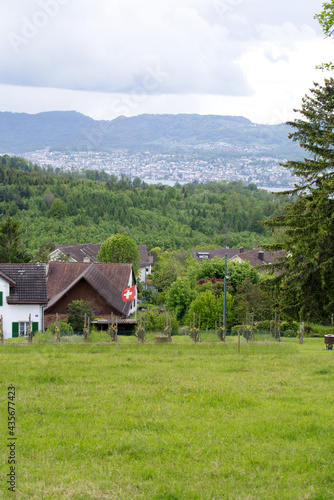 View from Zurich Witikon to city and lake Zurich and the Swiss alps. Photo taken May 25th, 2021, Zurich, Switzerland.