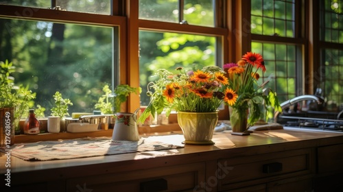 view, kitchen, counter, window, illustration, rustic, wooden, garden, vase, flower, colours, space, design, decor, natural, light, greenery, fresh, interior, home, style, cosy, charming, bright, scenic, arrangement, aesthetic, atmosphere, peaceful, inviting, picturesque