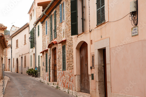 View of a medieval street of the picturesque Spanish-style village Mancor de la Vall in Majorca or Mallorca island, Spain.
